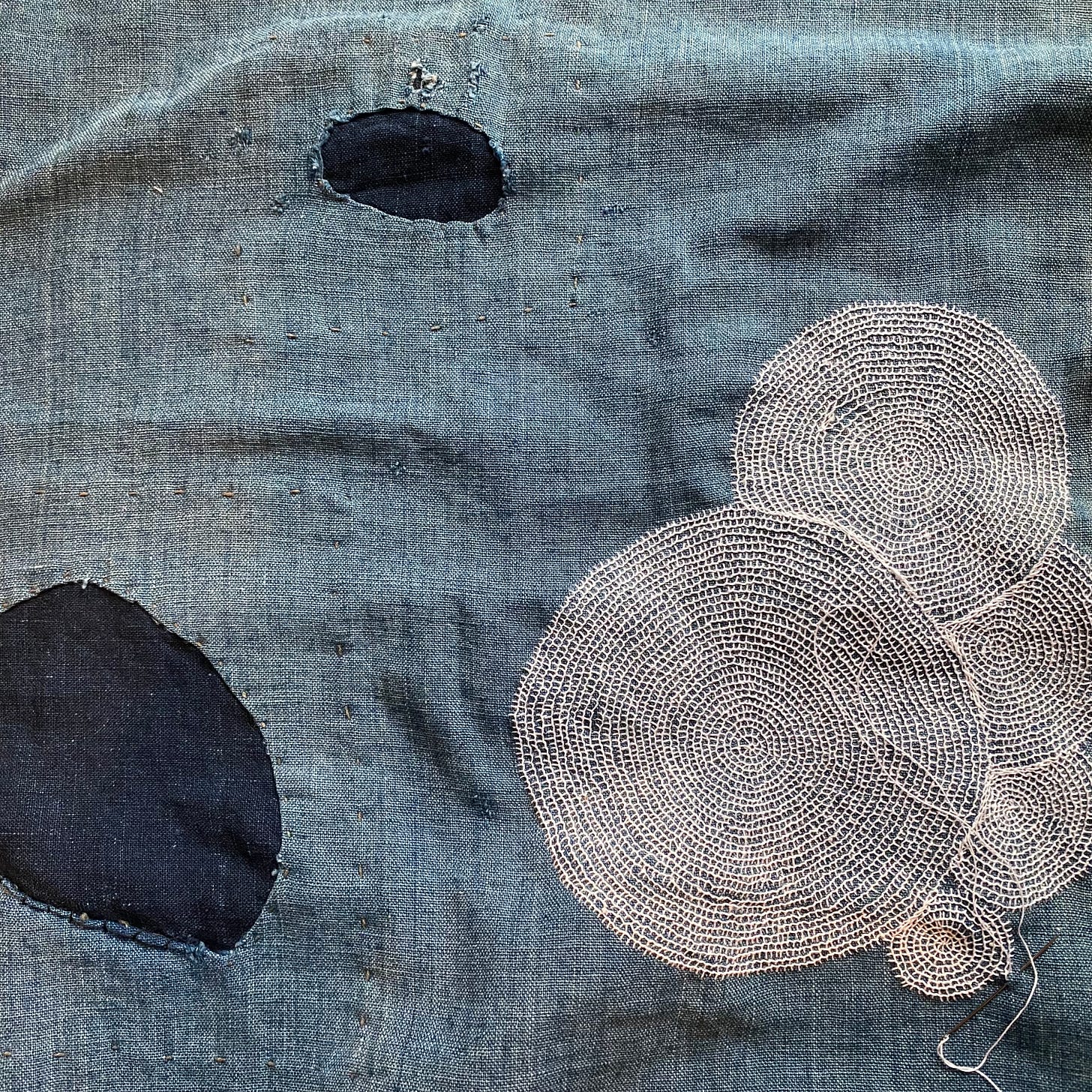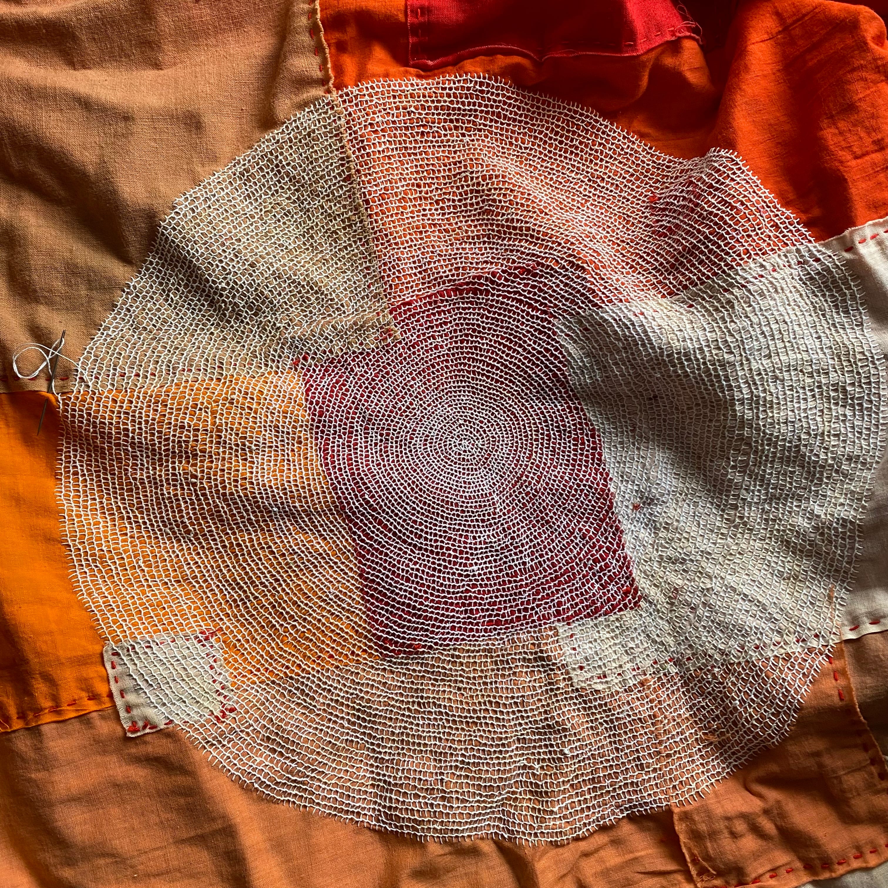 In handwork, it’s tempting to treat a stitch as singular gesture, one unit of labor. But the moment a second stitch is made, relationship begins. Line, angle, tension: all are now relative. By the tenth stitch, I’m no longer simply placing marks; I’m negotiating with a developing structure that already has expectations.