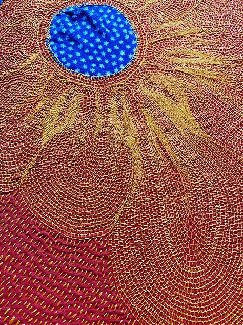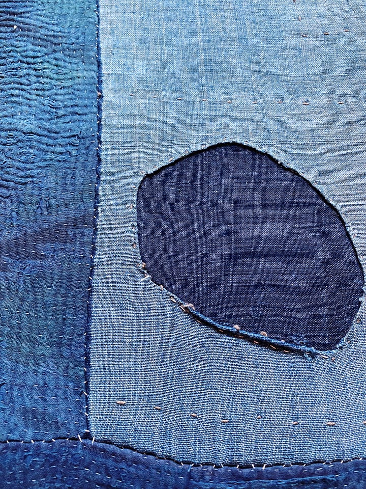 Sometimes I come across a textile that has too much evidence and history of someone else’s work and energy, and it feels wrong to overwork it or obscure that fact. This work is unusual for me in the fact that I didn’t cover the entire space, but I wanted to leave the mended places alone. Also, it’s framed in a few strips of very fine antique Kantha.