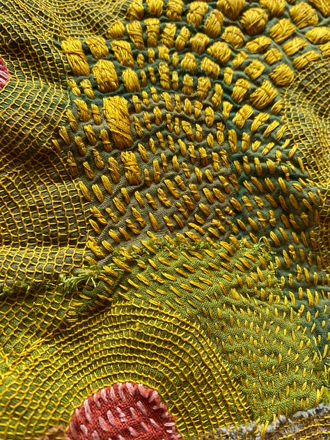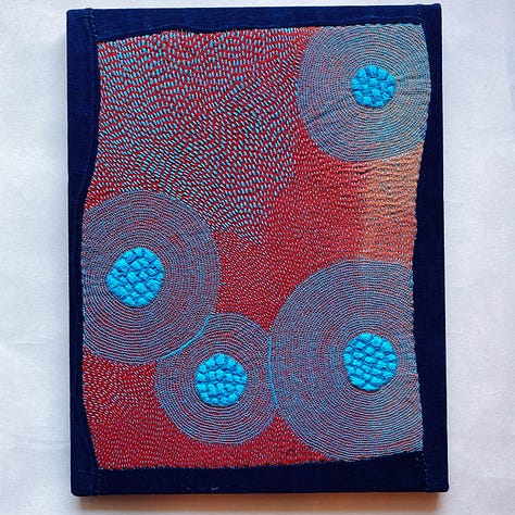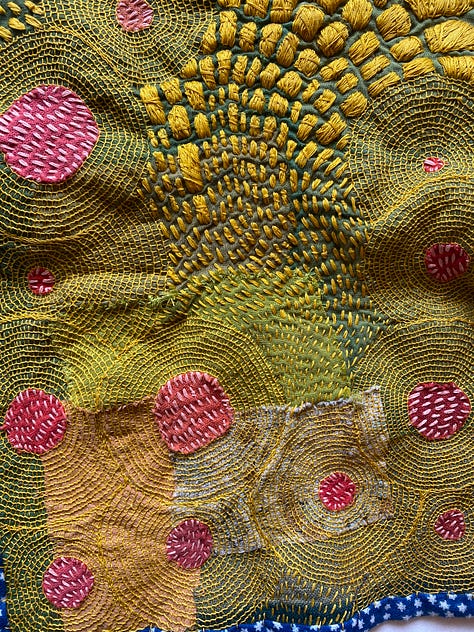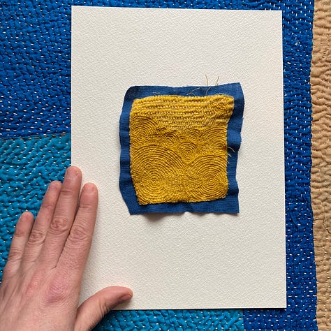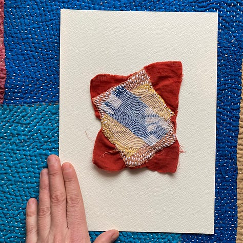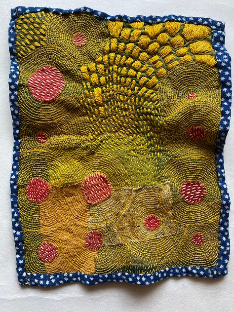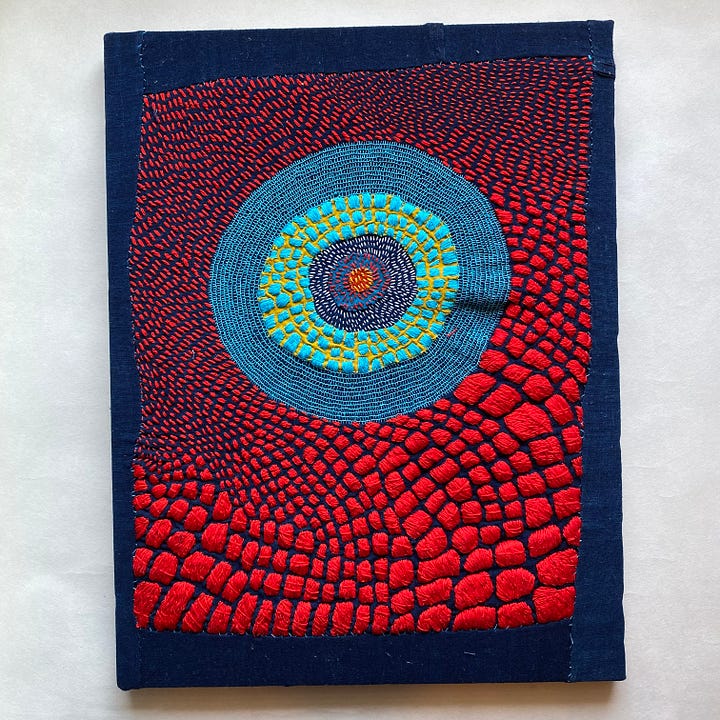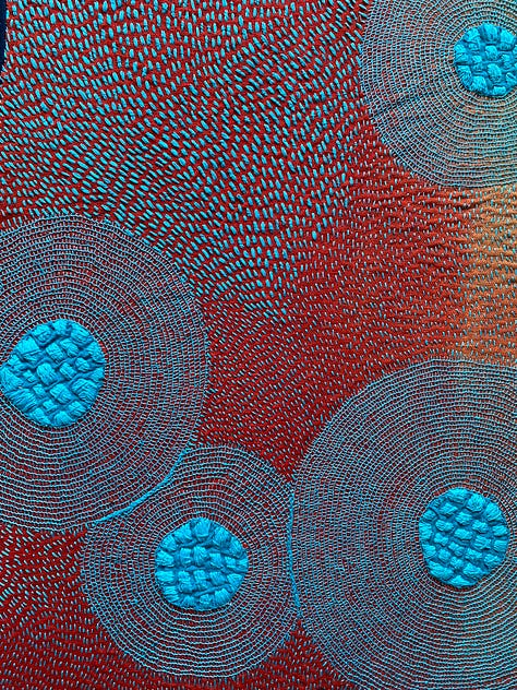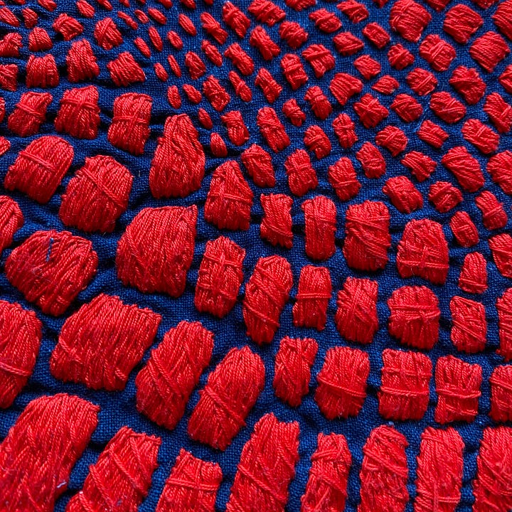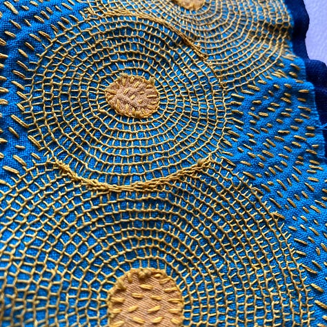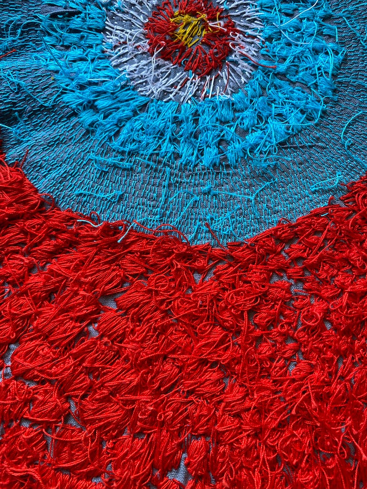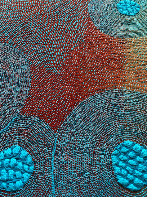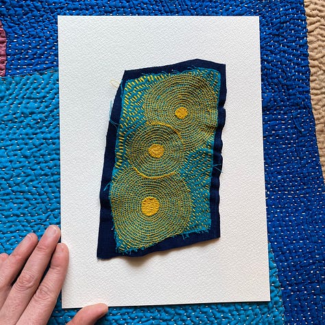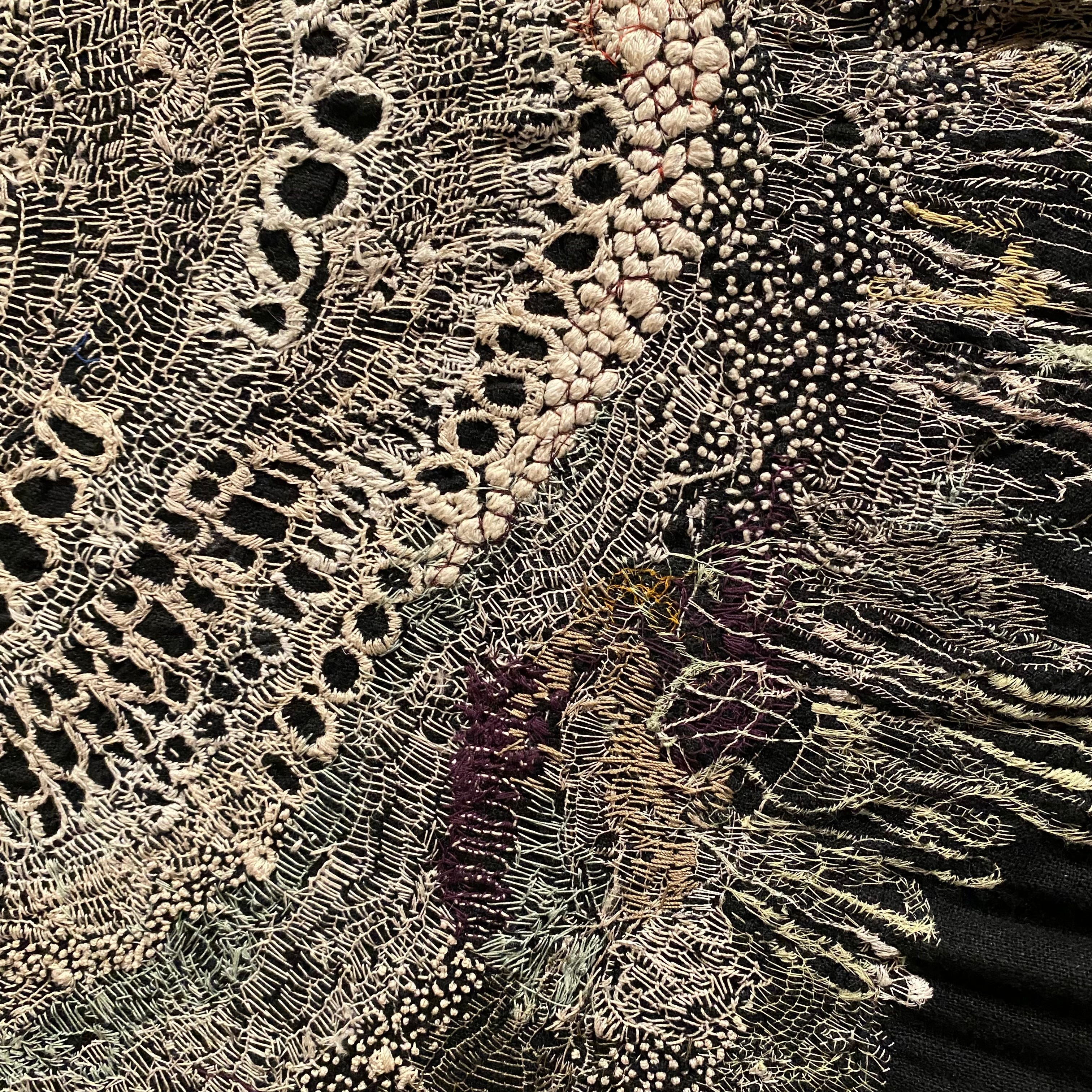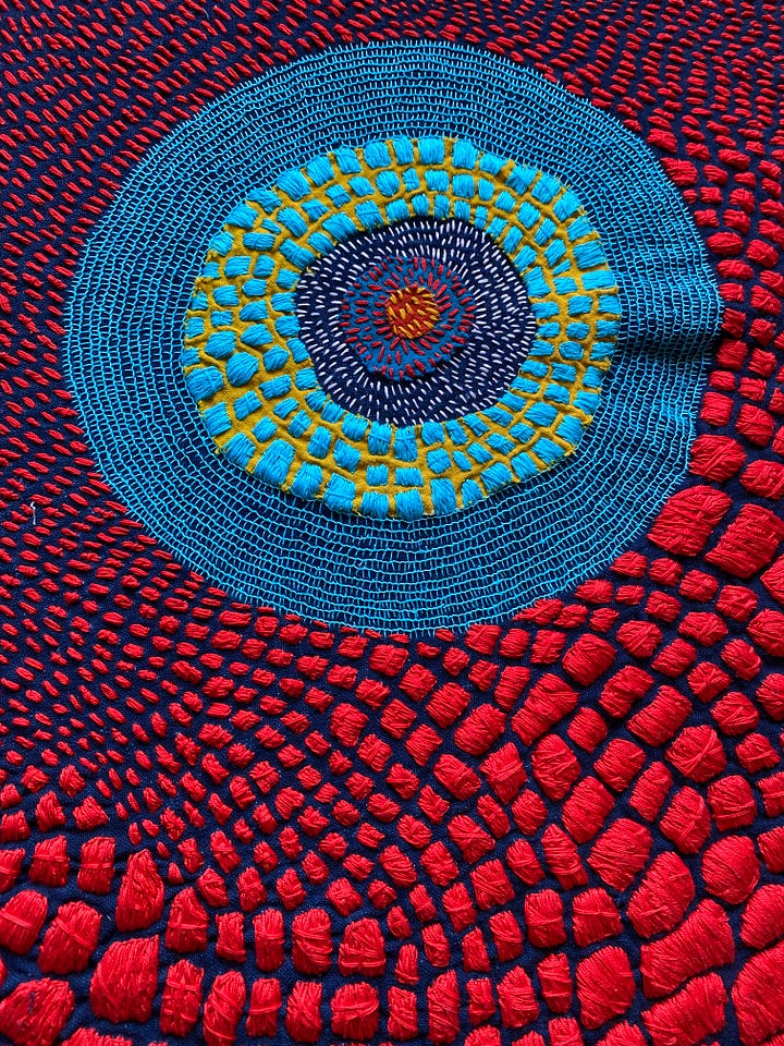Last but not least, I worked on a few smaller works I’ve decided to call Satellite Fragments. Small explorations mirroring larger themes. I’m inspired by outerspace, space travel, and the universe. The circles in my work are held in gravity with one another, like a satellite. Connected no matter the distance. And each accumulation of thread its own discrete unit, isolated, and yet part of a field.